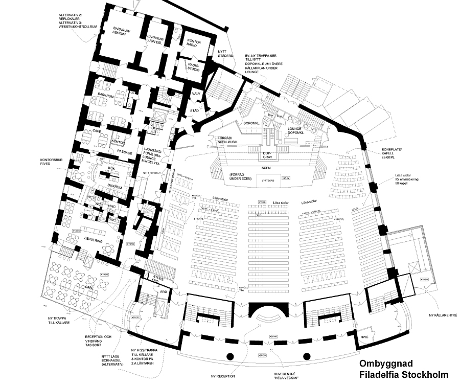 Filadelfiakyrkabn i Stockholm. Flera olika skisser och ombyggnadsprojekteringar 2008-10, 2014.